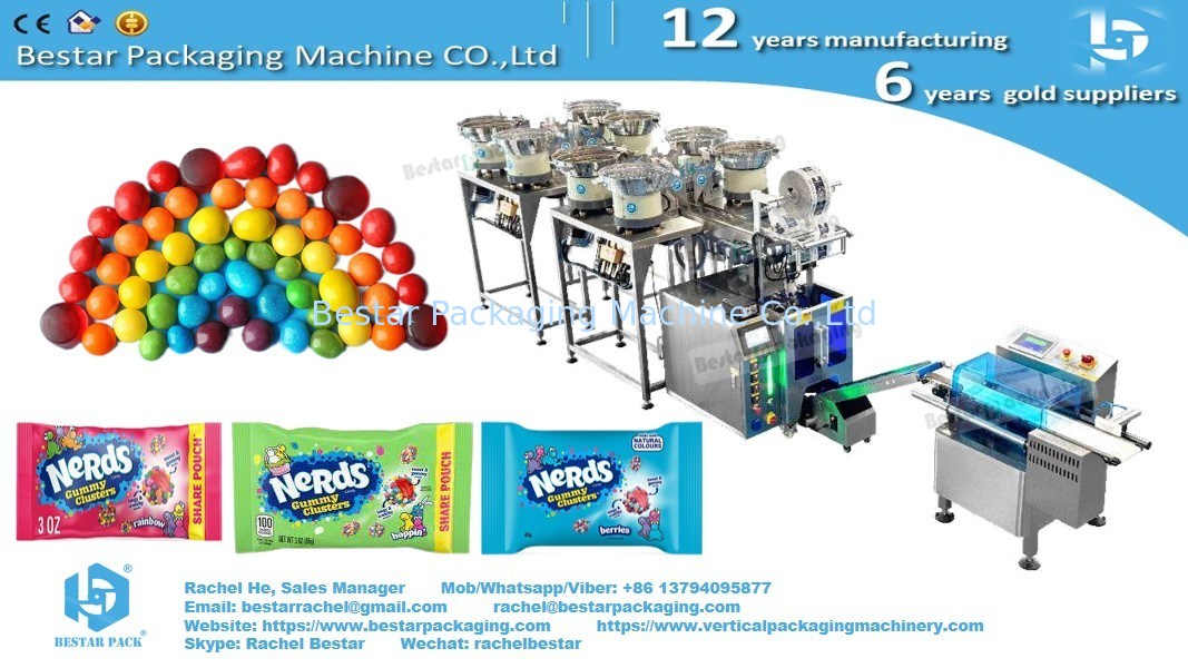 Bestar advanced 8-vibratory bowl machine accurately counts and packages candies, pills, tablets, and small items into sachet packs. Fully integrated with:
