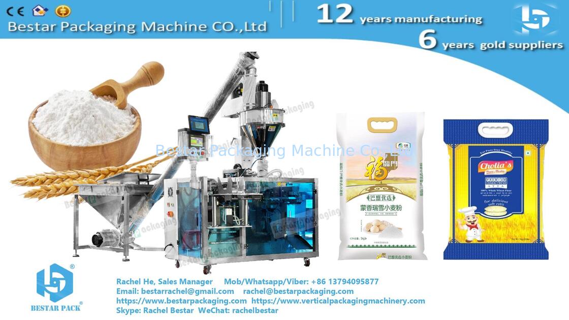 Bestar automatic doypack machine 4 stations model, to handle pre-made zipper bags packing flour. It fills 5kg of powder precisely by auger screw dosing. Bestar innovative feeding bags system, there are standby bags at the second station, continuous feeding bags, no need to wait or stop the machine to add new bags. Typical Products: Wheat flour, construction powder, premix feed, industrial powders.